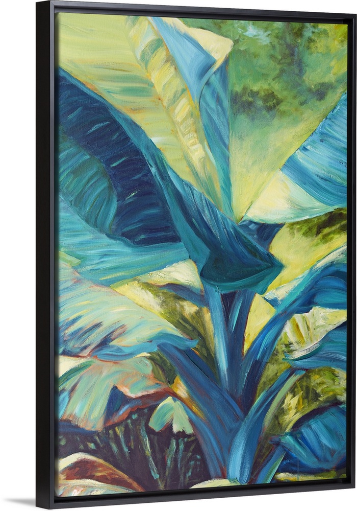 <p>Vibrant colors and energetic brush strokes create youthful, tropical leaves in this contemporary artwork.</p>