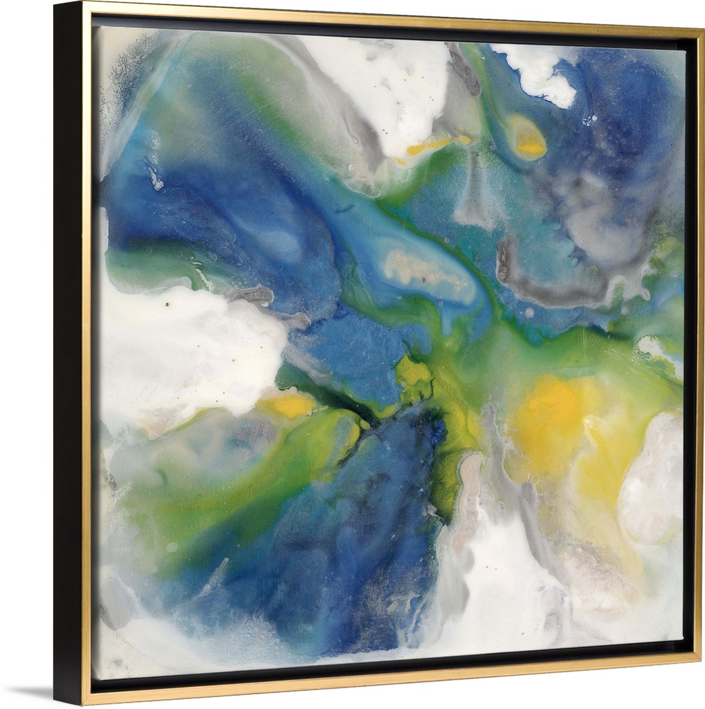 <p>Contemporary abstract painting of saturated blue and green tones in a swirling motion.</p>
