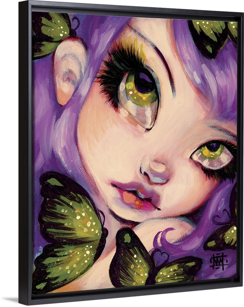 <p>Fantasy painting of a woman with large eyes, violet hair, and butterflies.</p>