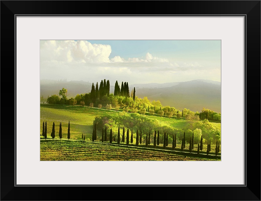 <p>Artwork done of a massive field in Italy that is covered with several types of trees and a large hill can be seen slightly through fog in the background.</p>