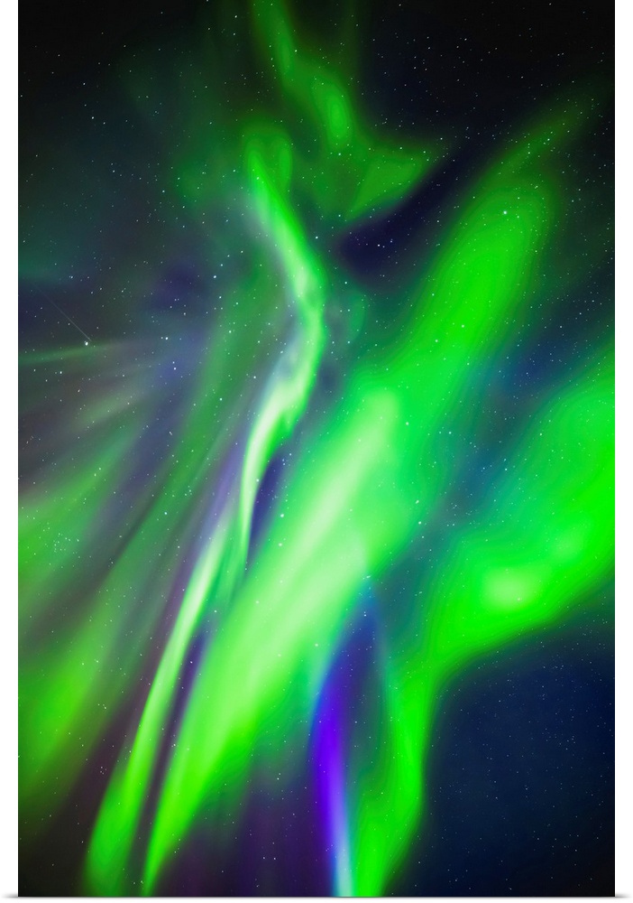 <p>Green glowing northern lights in a starry sky, elk island national park, Alberta, Canada.</p>