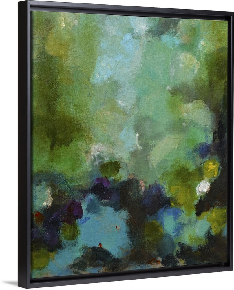 <p>Aqua toned abstract painting, reminiscent of a pond or garden.</p>