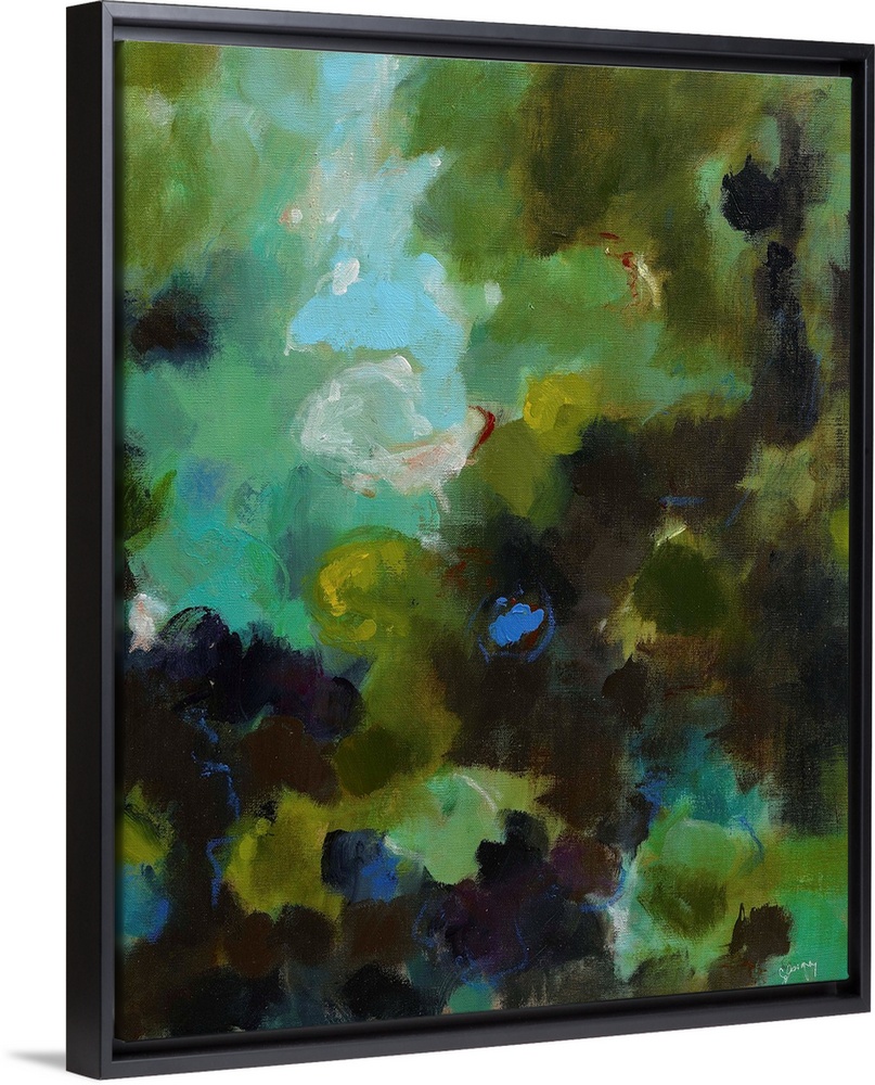 <p>Aqua toned abstract painting, reminiscent of a pond or garden.</p>