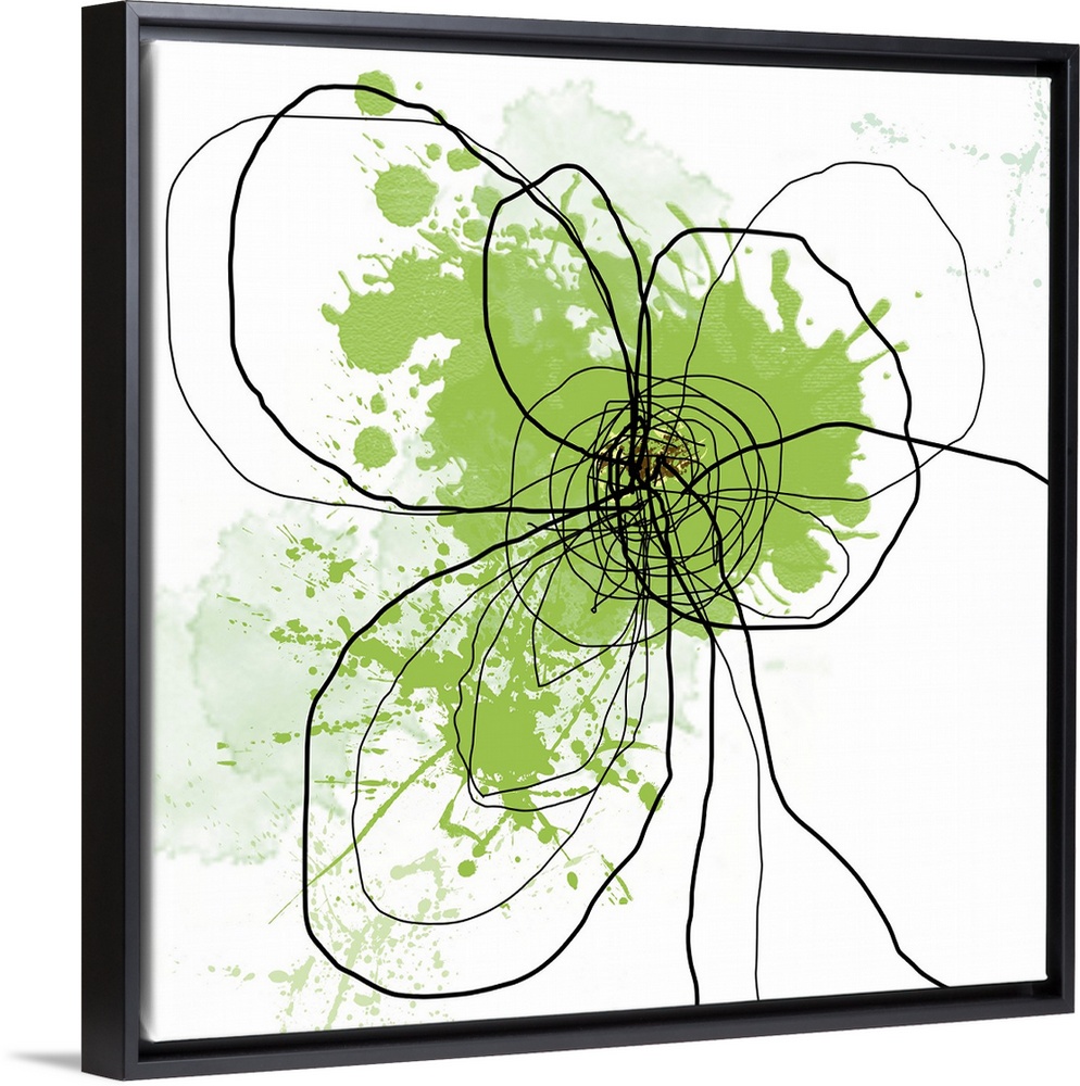 <p>Oversized, square, abstract art of the outline of a flower illustrated with squiggly black lines and green splatters of paint beneath, on a white background.</p>