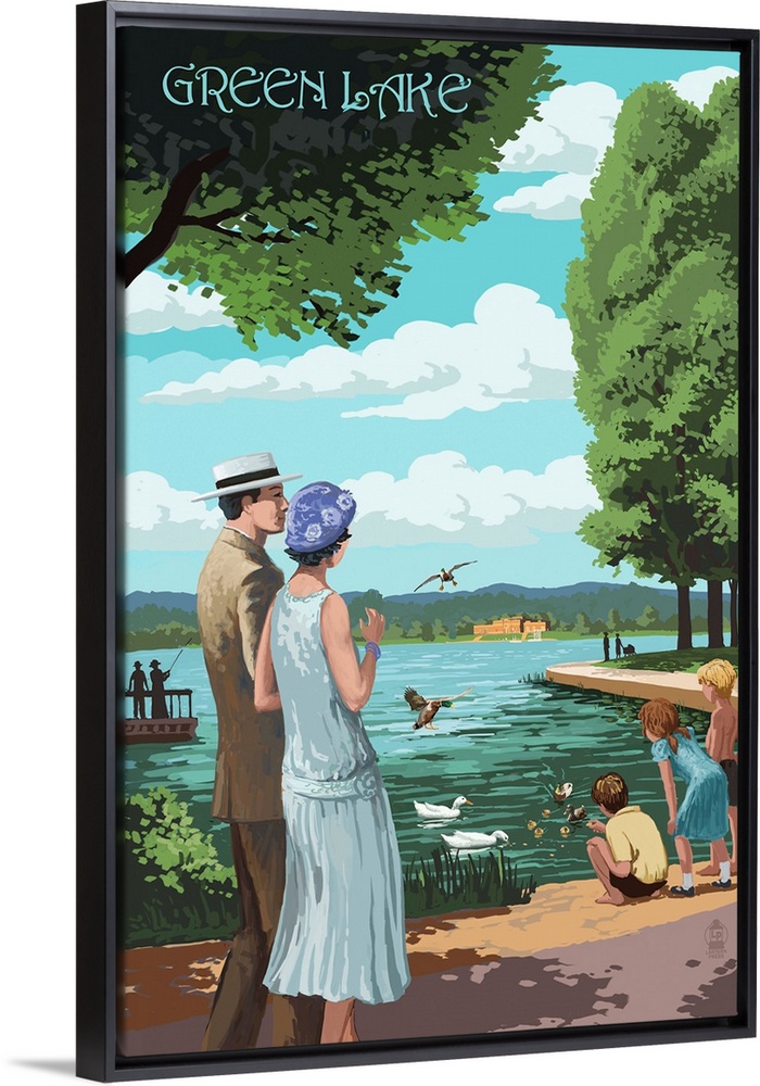 <p>Retro stylized art poster of a couple walking along a pathway, looking out at the lake.</p>