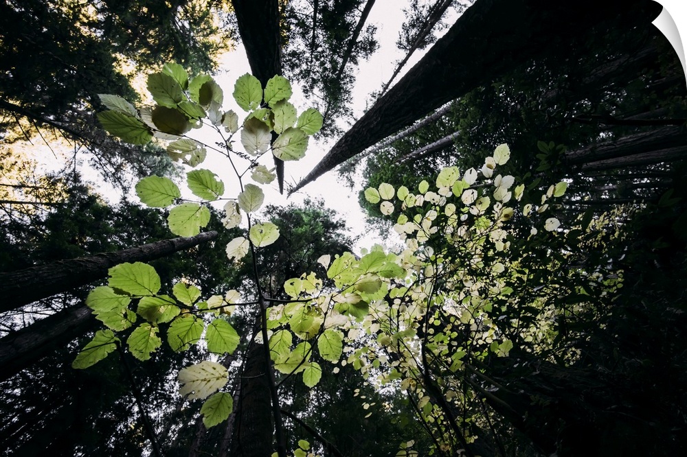 <p>Green leaves on a tree with a view of the tall tree trunks in a forest; California, United States of America</p>