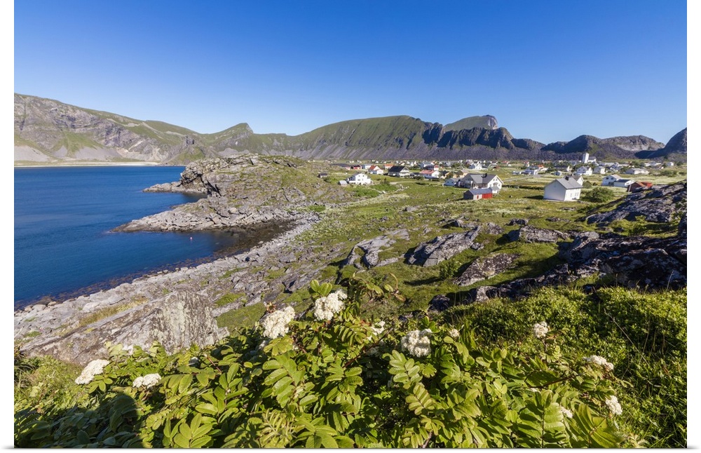 <p>Green meadows frame the village of Sorland surrounded by sea, Vaeroy Island, Nordland county, Lofoten archipelago, Norway, Scandinavia, Europe</p>