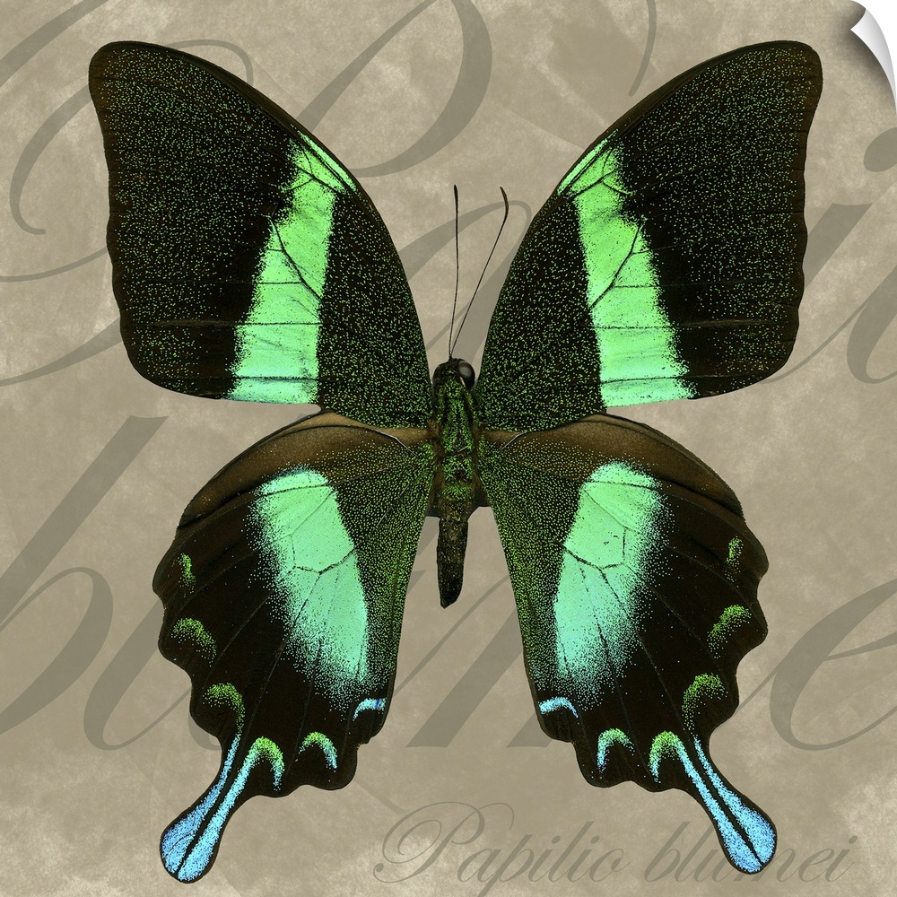 <p>Square painting of a butterfly on canvas with text overlaid in the background.</p>