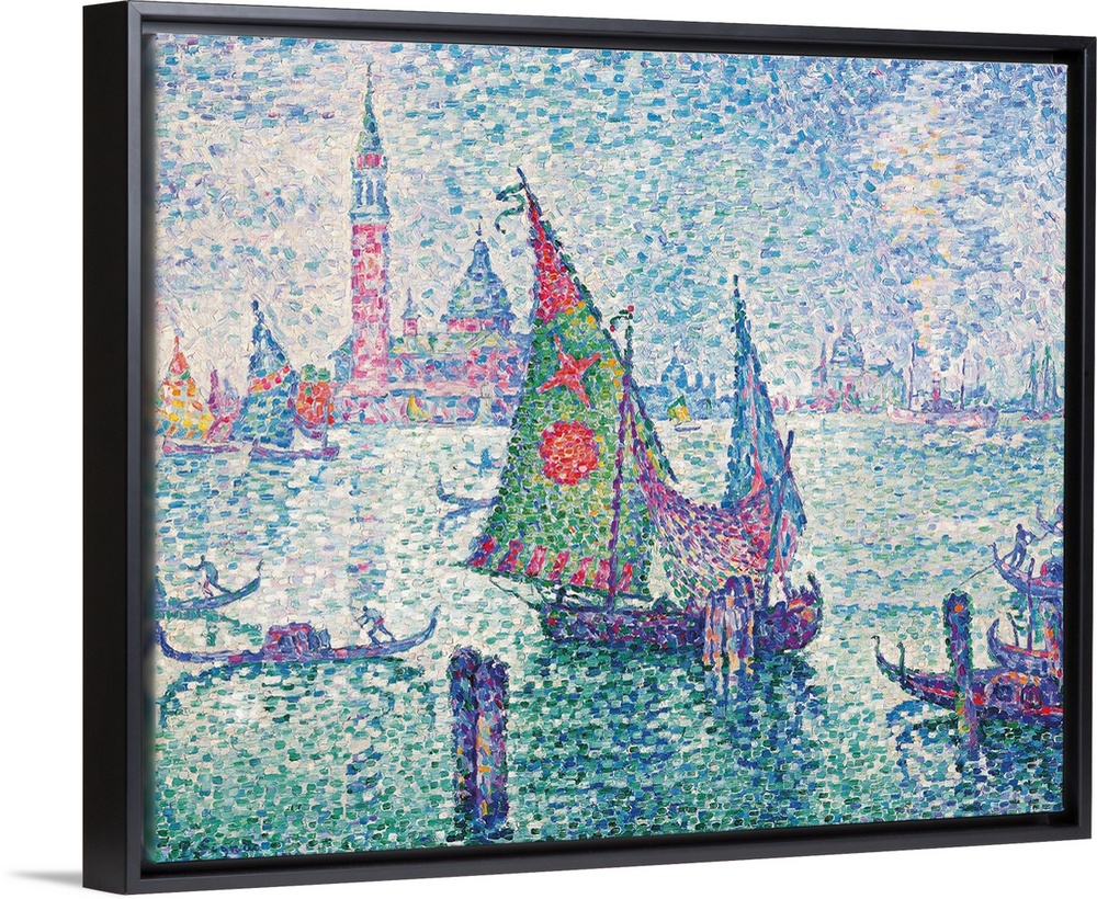 <p>The Green Sail, Venice, by Paul Signac, 1904, 20th Century, oil on canvas, cm 65 x 81 - France, Ile de France, Paris, Muse dOrsay, RF1976-77. All. The green sail, Venice port sea azure light blue grey shore water waves tower clouds pink boat sail gondola</p>