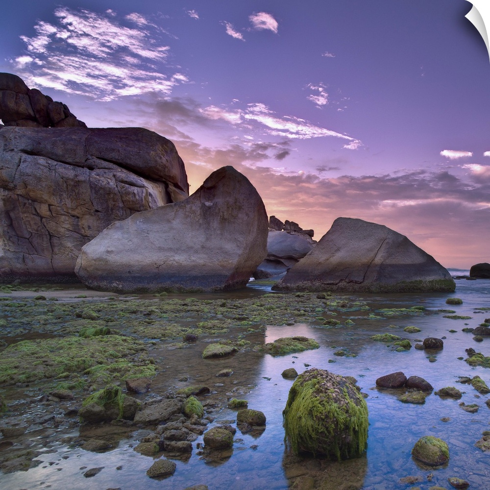 <p>Green sea moss attached to coral rocks in low tide at sunrise in Vinh Hy Bay, Thai An village, Vietnam.</p>