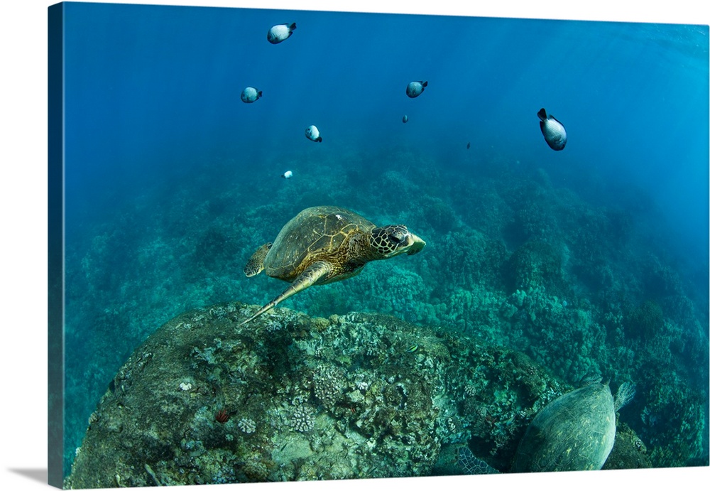 <p>Green Sea turtle and fish swimming in the Pacific Ocean, Hawaii, USA</p>