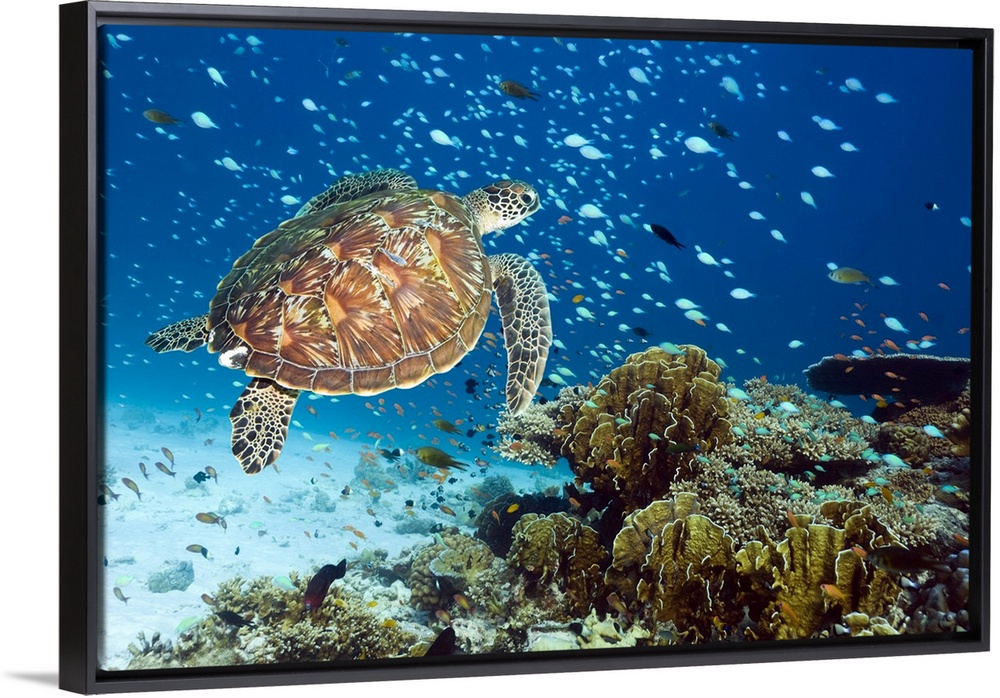 <p>Green turtle (Chelonia mydas) swimming with reef fish over a coral reef. Green sea turtles are found in warm tropical waters. They are herbivorous, eating algae and sea grasses, and can grow up to 1.5 metres in length. Photographed in the Andaman Sea off the coast of Thailand.</p>