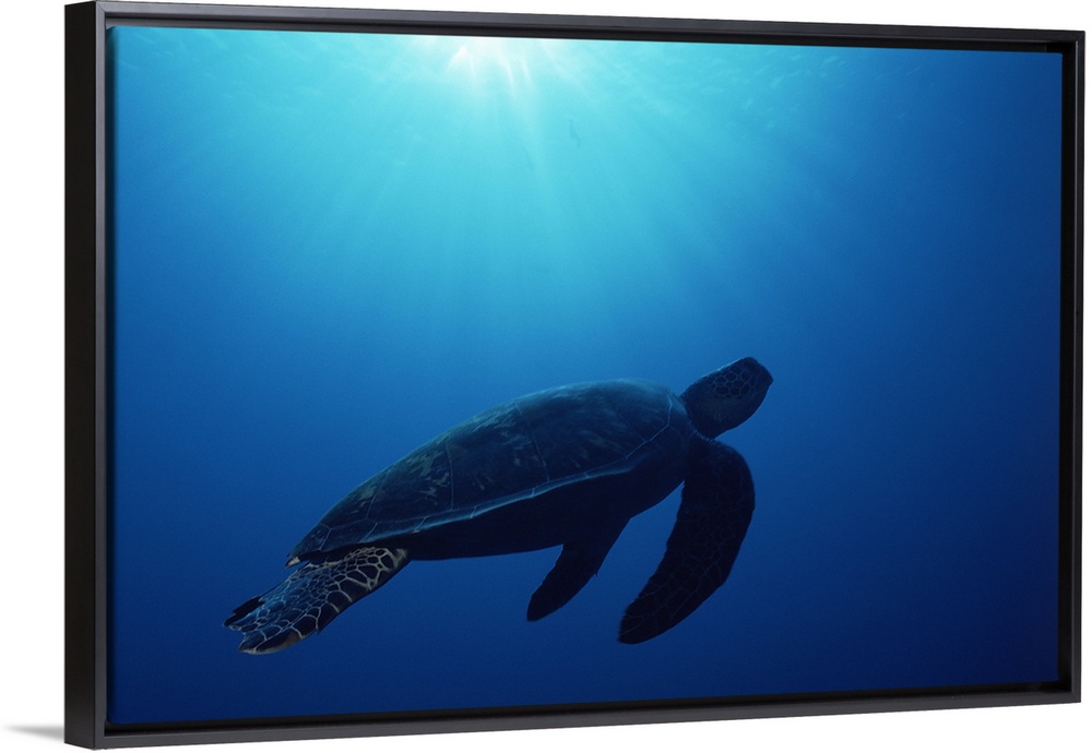 <p>Green sea turtle (Chelonia mydas) silhouetted underwater, Banda Sea, Island of Borneo, Malaysia</p>
