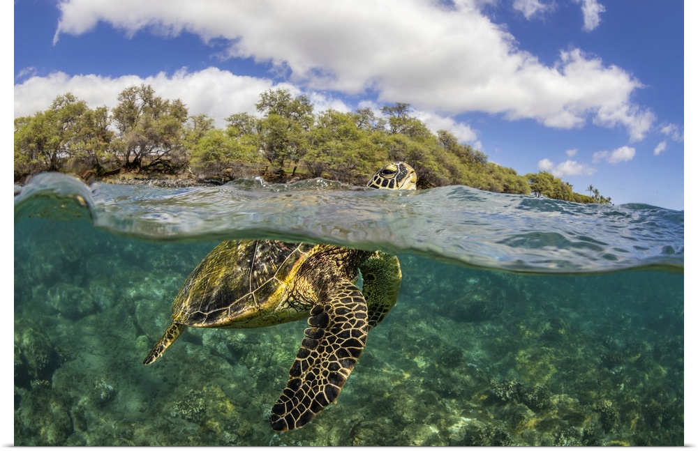 <p>Green sea turtle (Chelonia mydas), an endangered species, lifts its head for a breath over a shallow reef in Hawaii, Hawii, United States of America</p>