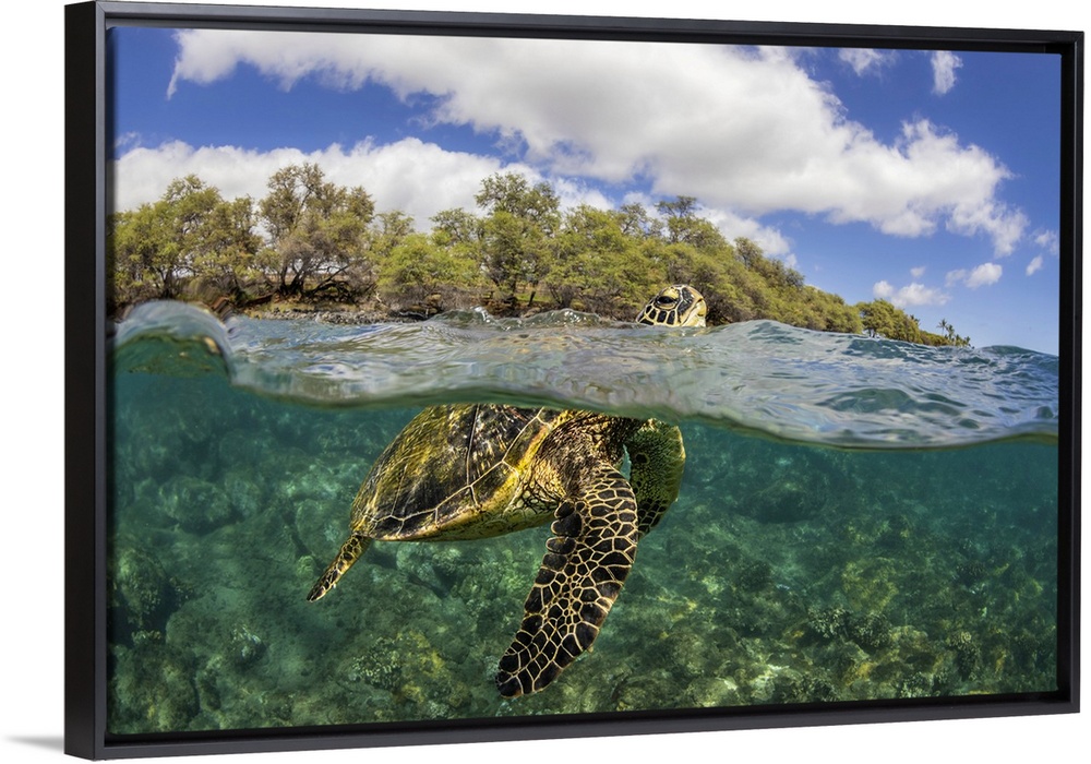 <p>Green sea turtle (Chelonia mydas), an endangered species, lifts its head for a breath over a shallow reef in Hawaii, Hawii, United States of America</p>