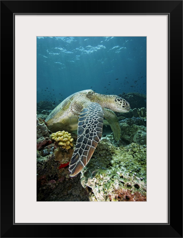 <p>Green Sea Turtle (Chelonia mydas) on coral reef, endangered, Sipadan Island, Celebes Sea, Borneo</p>