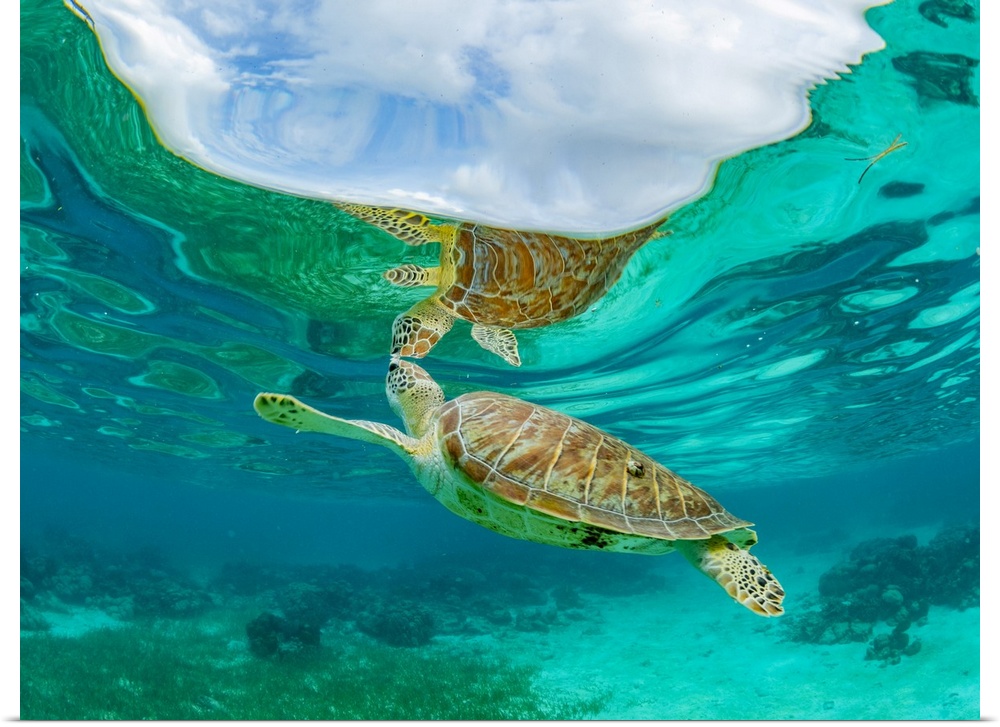 <p>Green sea turtle (Chelonia mydas), surfacing for air near Caye Caulker, inside the Mesoamerican Barrier Reef, Belize</p>