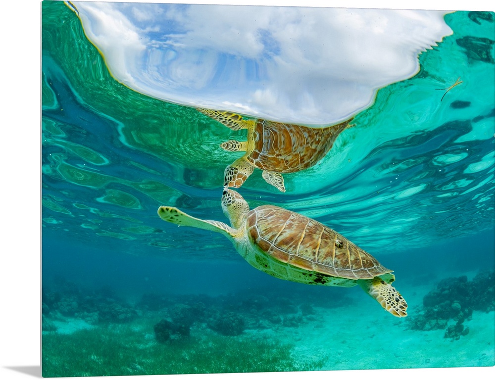 <p>Green sea turtle (Chelonia mydas), surfacing for air near Caye Caulker, inside the Mesoamerican Barrier Reef, Belize</p>