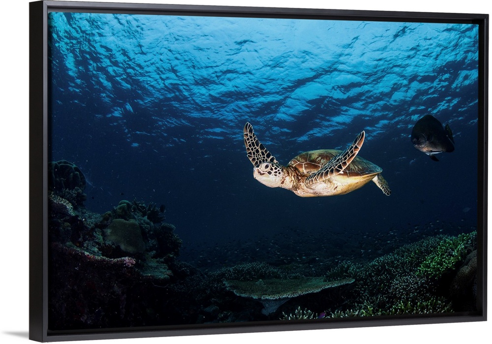 <p>Green sea turtle swimming over a coral garden in Sipadan, Malaysia.</p>