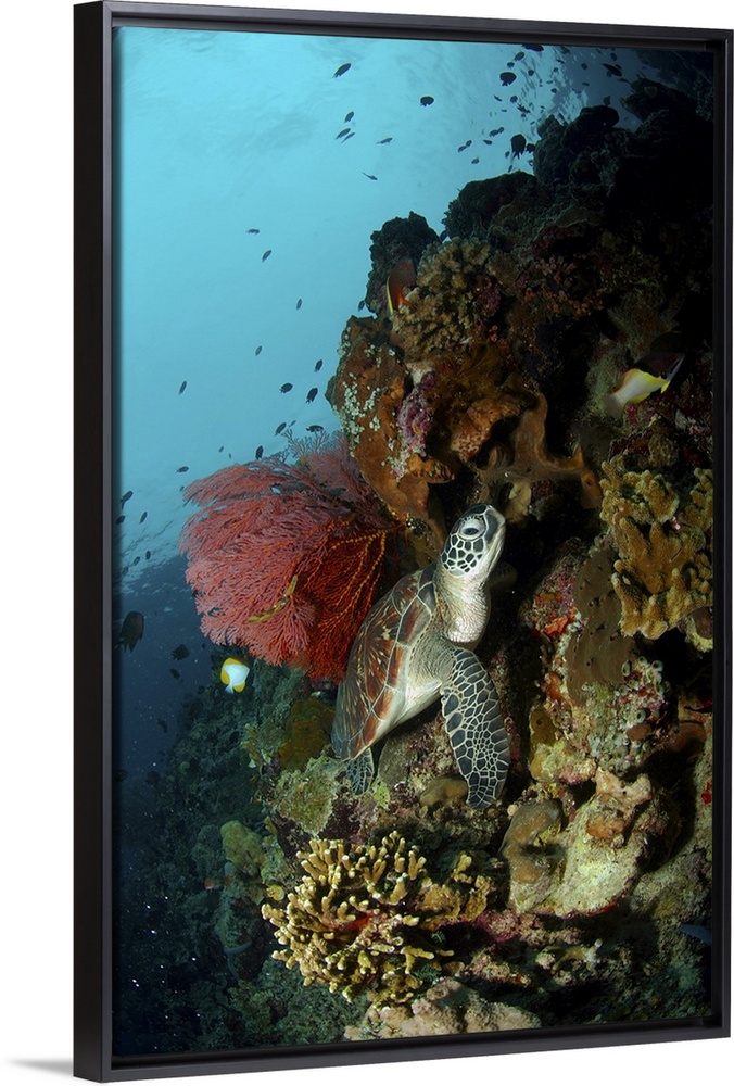 <p>Green sea turtle with a red gorgonian sea fan, North Sulawesi.</p>