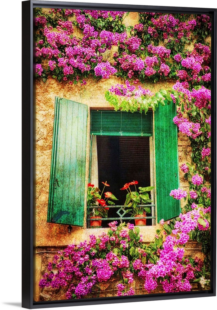 <p>Green shutters on a window surrounded by vibrant pink flowers growing on the wall.</p>