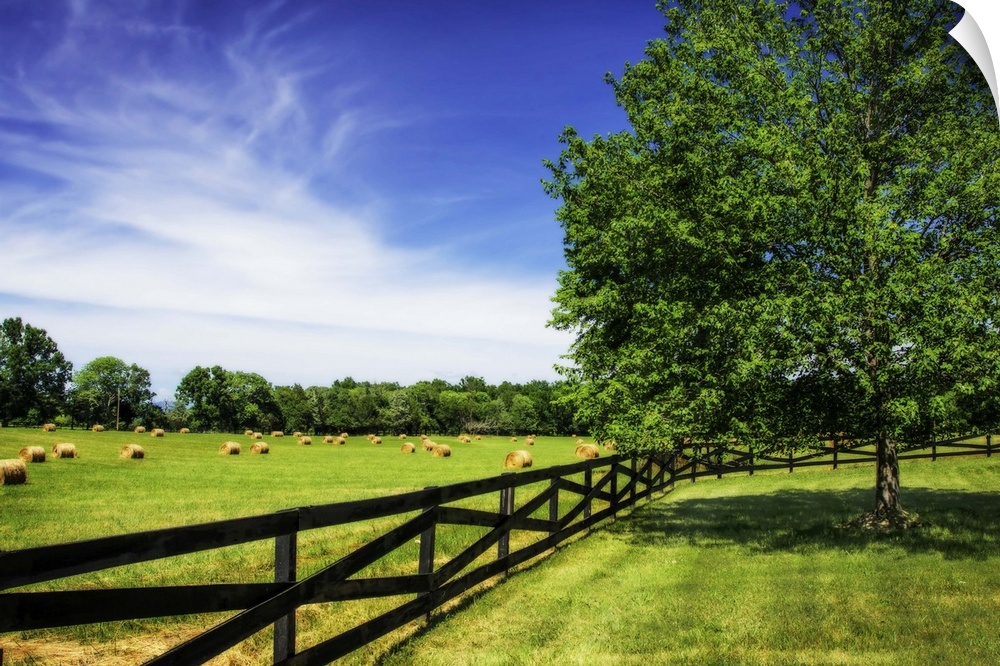 <p>A fence along the edge of a farm on a sunny day with a bright blue sky.</p>