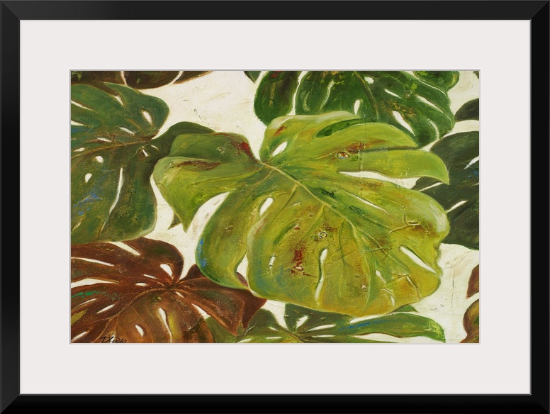 <p>Contemporary painting of big lush tropical green leaves.</p>
