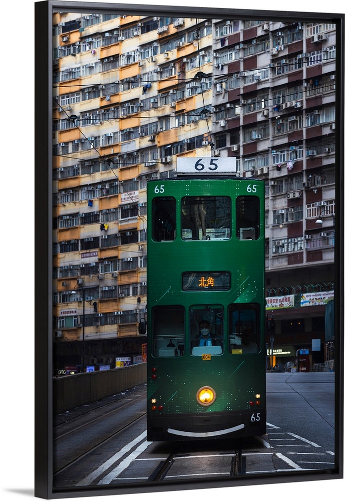 <p>Green tram and Nam Tin building, North Point. Hong Kong, China.</p>