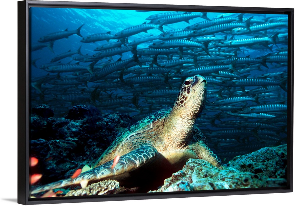 <p>Green turtle (Chelonia mydas) resting on rocks. In the background is a large school of barracuda (Sphyraena sp.). The green turtle can reach over 150 centimetres in length and weigh over 200 kilograms. It is exclusively herbivorous, feeding on aquatic plants. Like all reptiles it breathes air, and the females lay their eggs on land. Apart from this it is entirely aquatic. It inhabits tropical and subtropical coastal seas throughout the world. Photographed off Sipadan, Malaysia.</p>