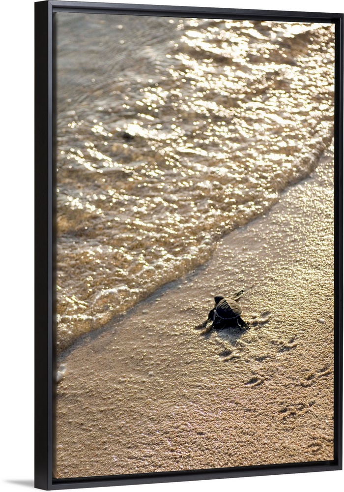 <p>Green turtle hatchling (Chelonia mydas) making its way to the water's edge. The female green turtle lays between 100 to 200 eggs per litter. After laying the female covers the eggs with sand and returns to the sea, leaving the hatchlings to fend for themselves. The eggs hatch at night after around 47-75 days and the hatchlings head directly to the sea. At this time they are very vulnerable to predators and many don't make it to the ocean. The sex of a hatchling turtle is dependent on the temperature at which they develop in the nest. Photographed on Sangalaki Island, in Kalimantan, Indonesia.</p>
