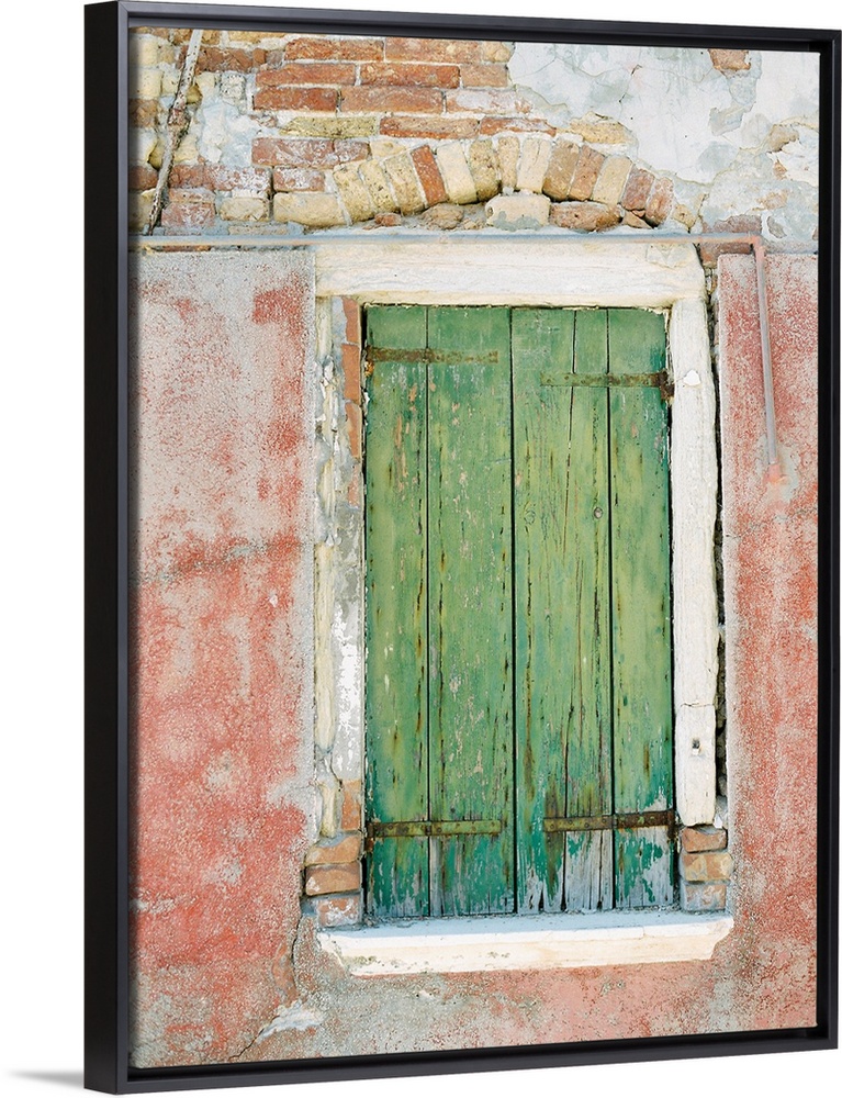 <p>Photograph of a small window with ancient green shutters, Burano, Italy.</p>