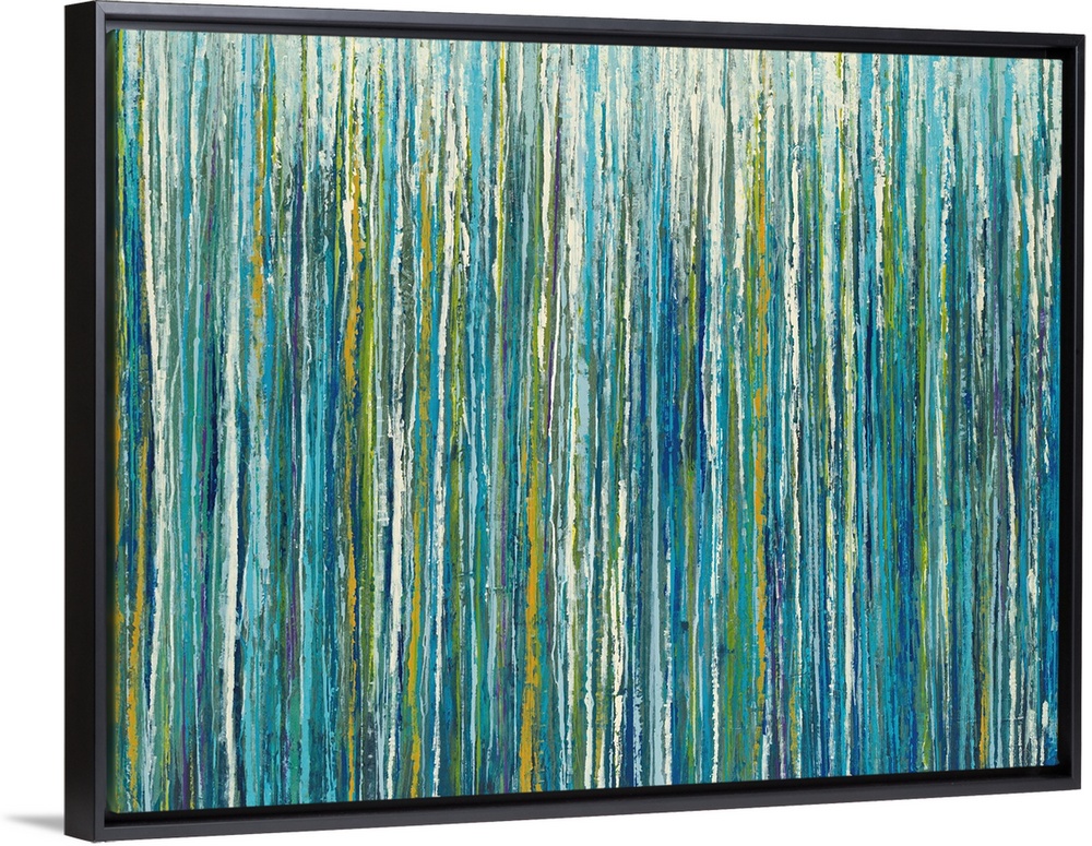 <p>Abstract painting with cool toned vertical lines layered on top and next to one another.</p>