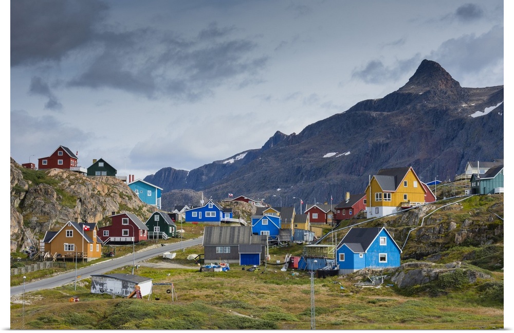 <p>Greenland, Sisimiut. Nasaasaaq mountain towering above colorful Sisimiut.</p>