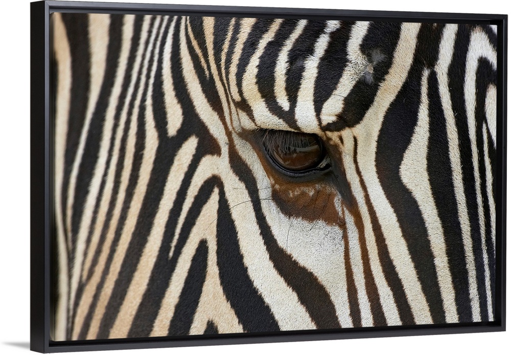 <p>Large photograph focuses on the head of a striped African wild horse standing still.</p>