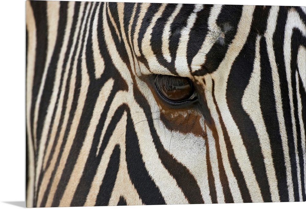 <p>Large photograph focuses on the head of a striped African wild horse standing still.</p>