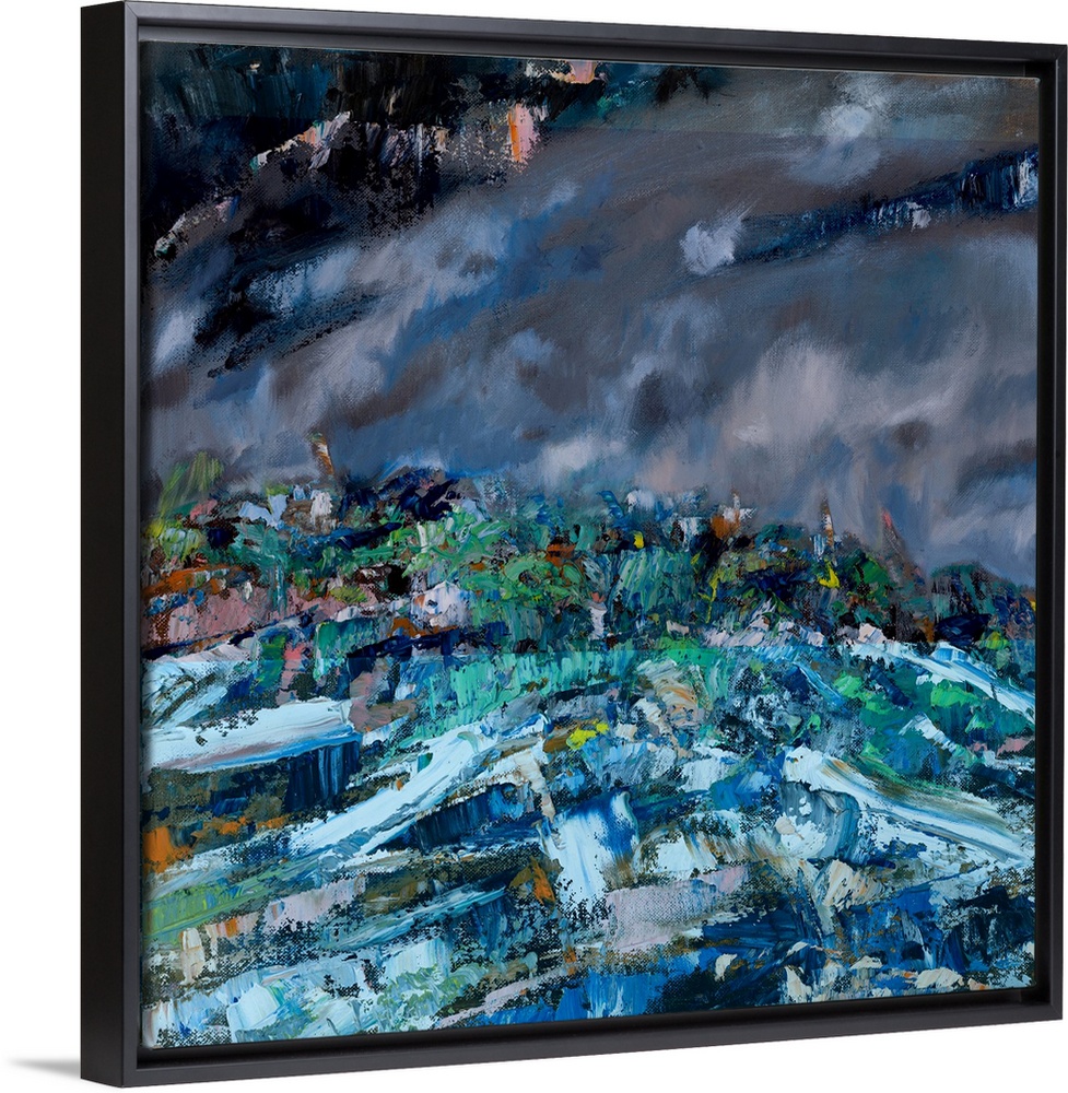 <p>An abstract painting of a shared walk by the coast line on a grey and windy day.</p>