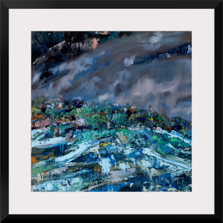 <p>An abstract painting of a shared walk by the coast line on a grey and windy day.</p>