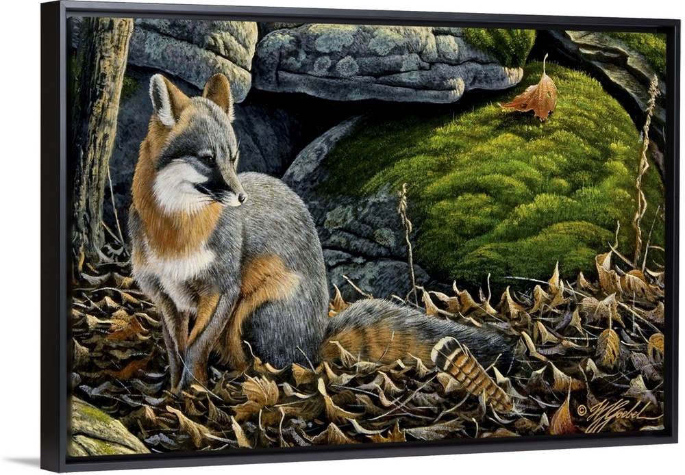<p>Grey fox in fall leave next to rocks.</p>
