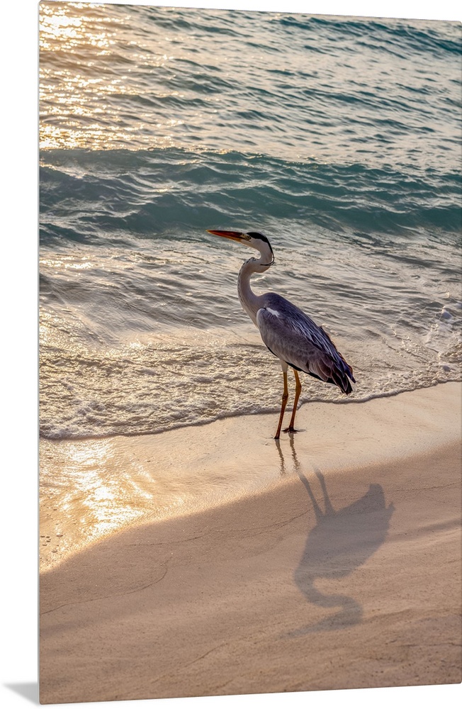 <p>Grey Heron (Maakana) on the shoreline of the lagoon on an exotic Island at dusk, The Maldives, Indian Ocean</p>
