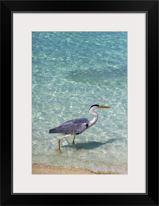 <p>Grey Heron (Maakana) on the shoreline of the lagoon on an exotic Island in The Maldives, Indian Ocean</p>