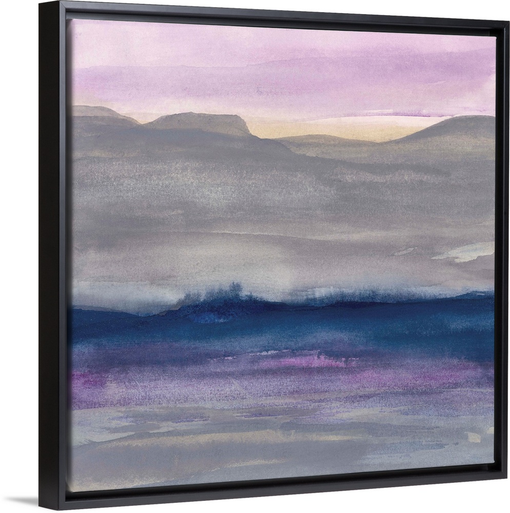 <p>Watercolor landscape painting with grey hills and a lavender sky.</p>