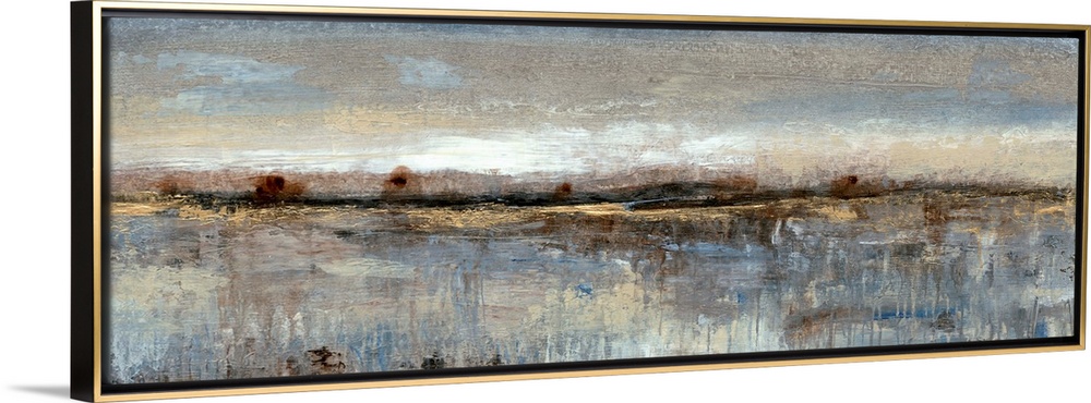 <p>This long, panoramic abstract painting is reminiscent of a coastal landscape. Impressionist-style brush strokes convey the sense of calm water beneath a cloudy sky, with trees, mountains and perhaps a few buildings on the horizon. It's neutral colors and simple subject would look equally at home in a traditional or contemporary setting; above a fireplace, sofa or dining table.</p>