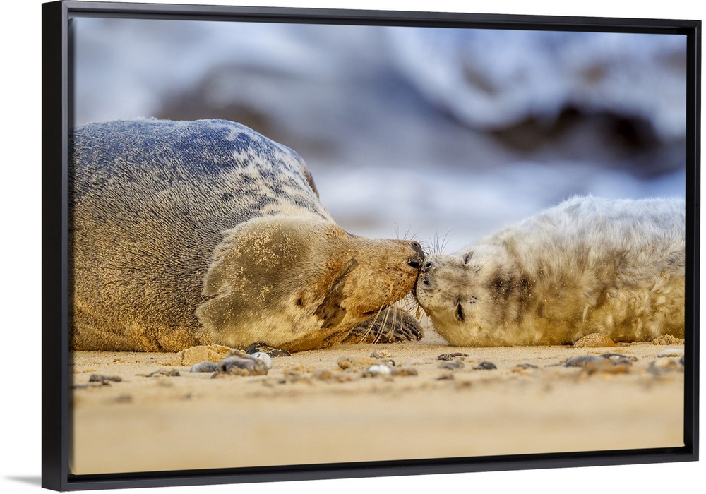 <p>Grey seal mother (Halichoerus grypus) and pup, Winterton on Sea beach, Norfolk, England, United Kingdom, Europe</p>