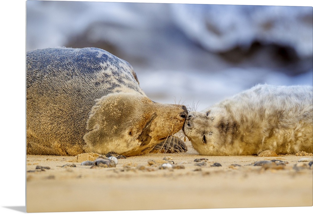 <p>Grey seal mother (Halichoerus grypus) and pup, Winterton on Sea beach, Norfolk, England, United Kingdom, Europe</p>