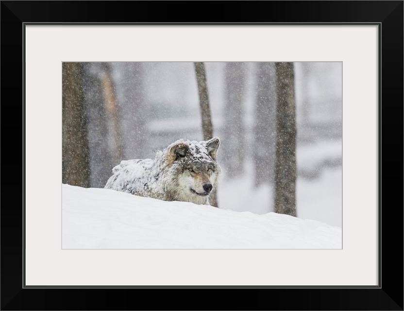<p>Grey wolf (Canis lupus) during a snow storm; Montebello, Quebec, Canada</p>