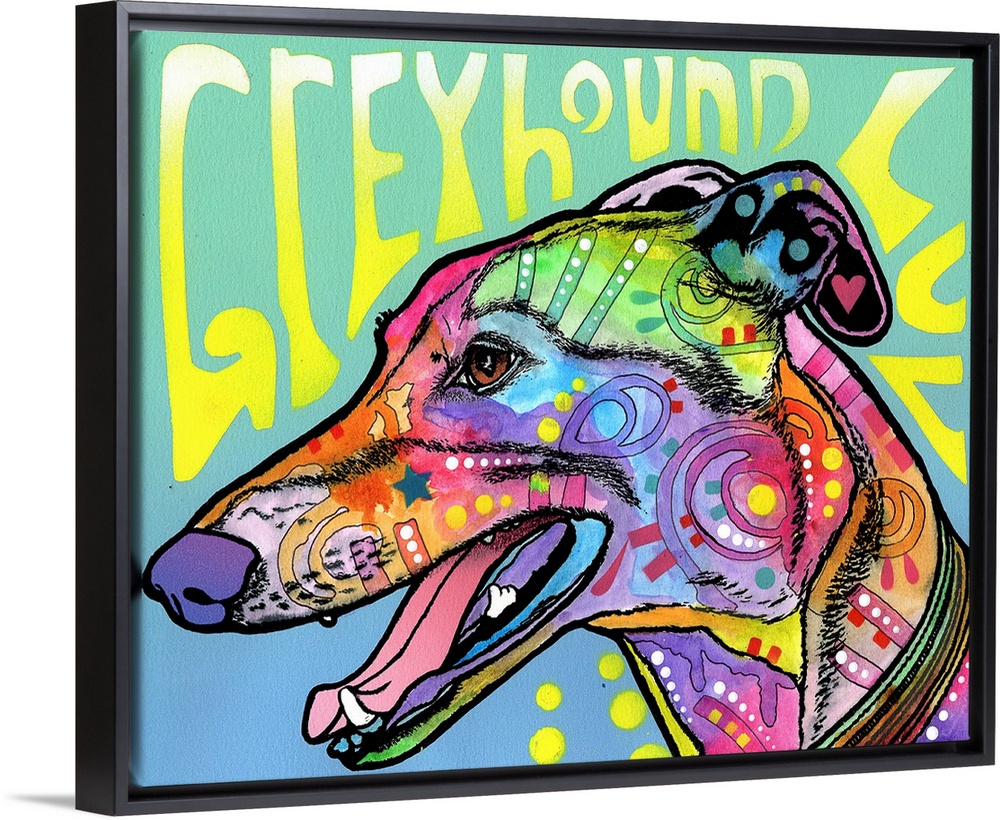 <p>Colorful painting of a Greyhound with graffiti-like designs on a green and blue background with "Greyhound Luv" spray painted at the top.</p>