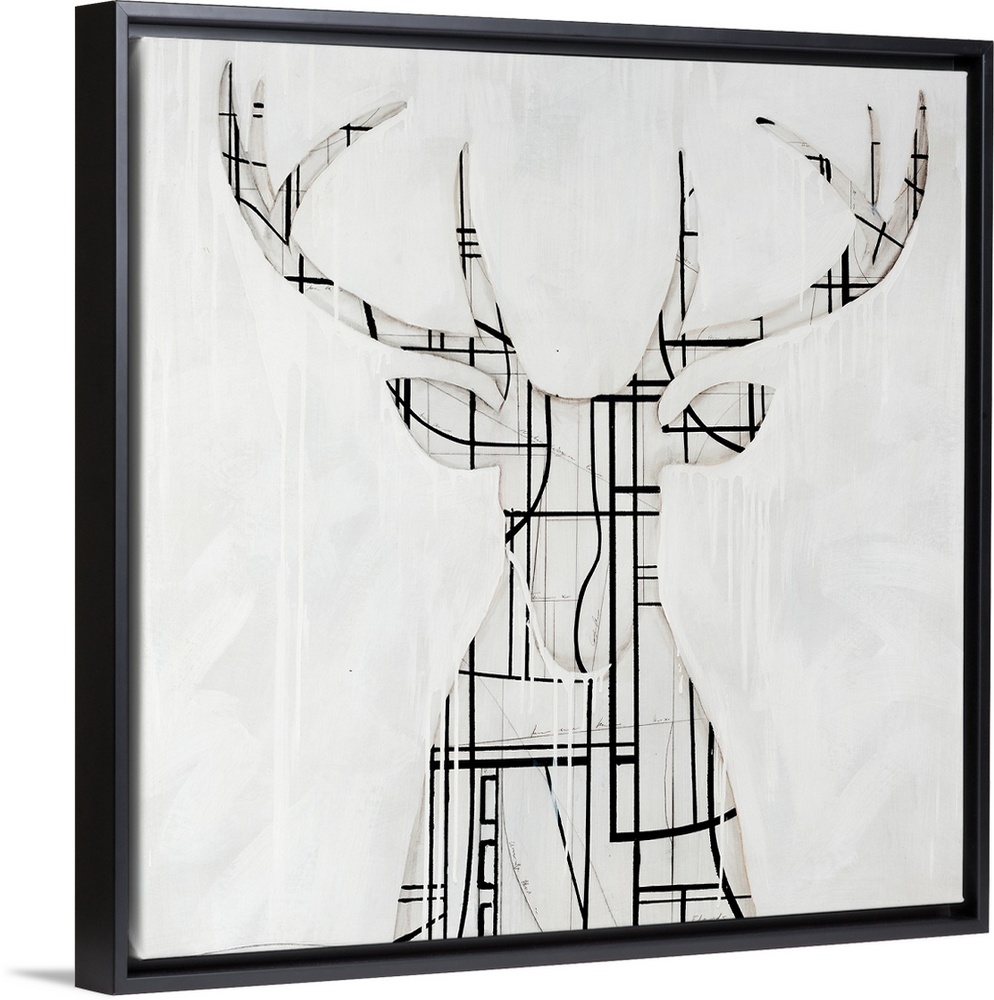 <p>Modern art of a silhouette of a buck with large antlers, his shape composed of contrasting geometric patterns and shapes, on a light background with faint brushstrokes in various sizes.</p>