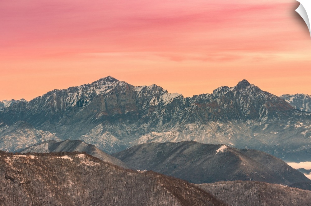 <p>Overviewed of Grigna settentrionale and Grigna meridionale peaks from Bollettone Mount and colourful sunrise sky in the background, Como province, Lombardy, Italy.</p>