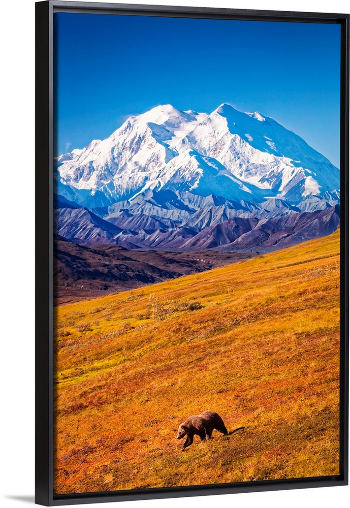 <p>Grizzly bear (Ursus arctos horribilis) taking a stroll on autumn coloured tundra with a view of Mount Denali (McKinley), Denali National Park and Preserve, Interior Alaska, Alaska, United States of America</p>