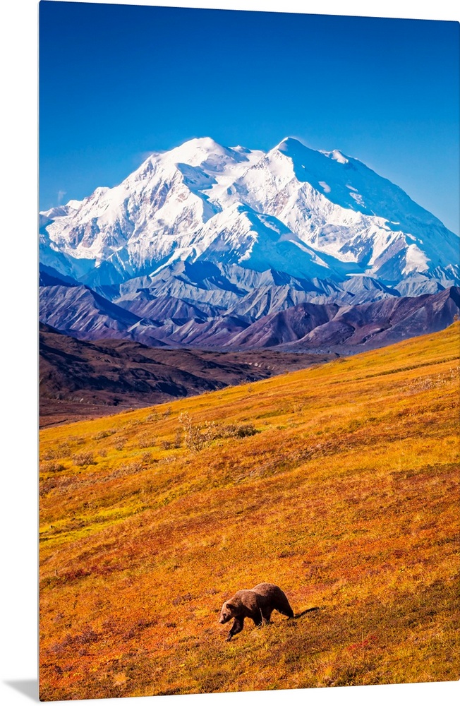 <p>Grizzly bear (Ursus arctos horribilis) taking a stroll on autumn coloured tundra with a view of Mount Denali (McKinley), Denali National Park and Preserve, Interior Alaska, Alaska, United States of America</p>